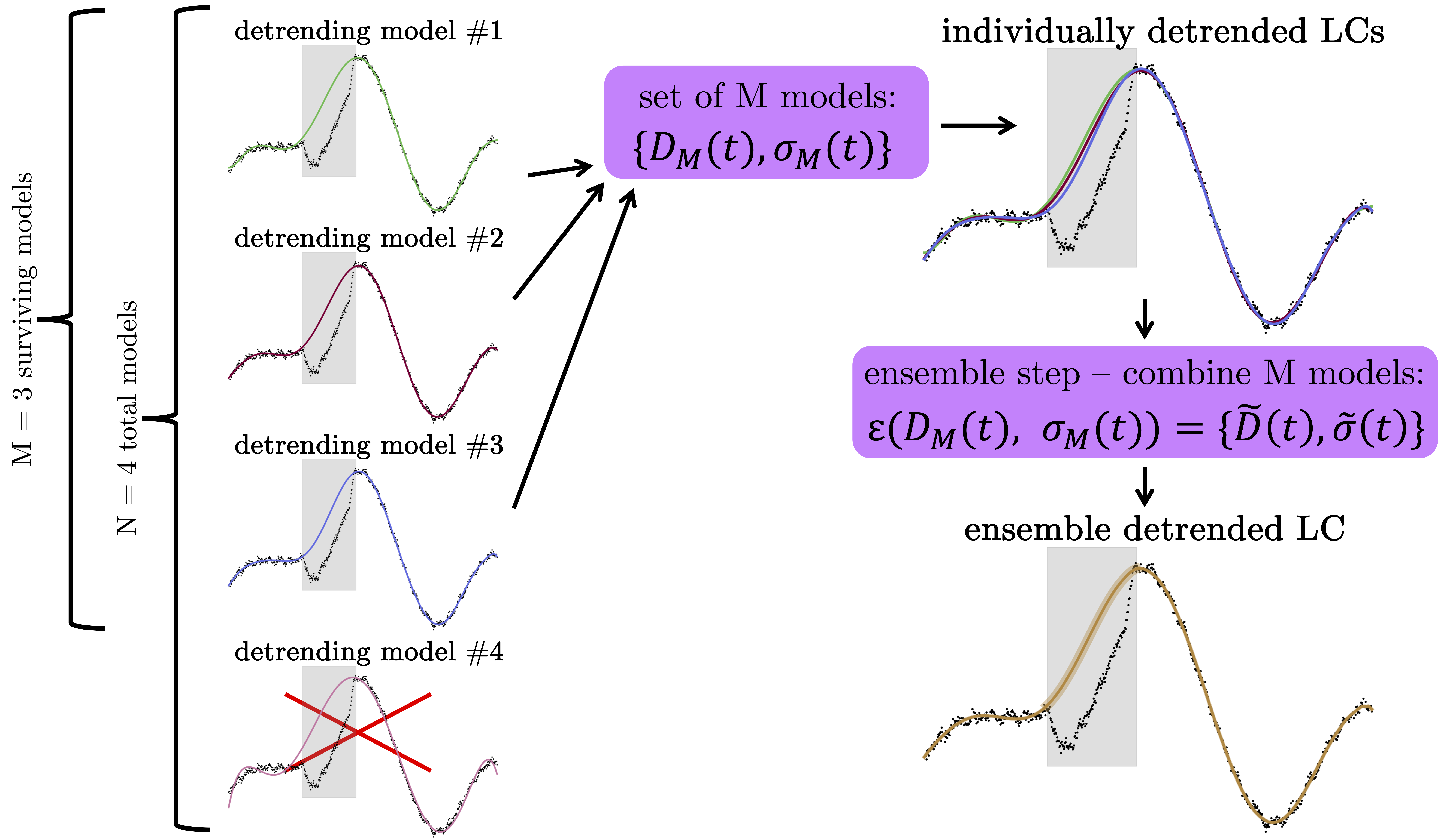 In the package, we currently use four distinct detrending algorithms, which have each been shown in the literature to be efficient and accurate models for stellar noise: CoFiAM, polyAM, local, and GP. For a more detailed description of each detrending algorithm, see below and for a similar application see \citet{Kipping2022}: